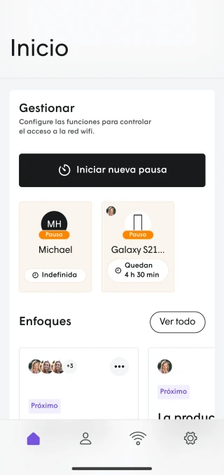 Herramientas intuitivas para gestionar usuarios, dispositivos y acceso a Internet. Los padres pueden asignar dispositivos a las personas para establecer niveles de acceso o programas de enfoque y bloquear dispositivos rápidamente. Los controles parentales avanzados permiten a los usuarios limitar el tiempo de pantalla de cada persona o dispositivo de la red y establecer filtros de contenido por edades para niños y adolescentes.