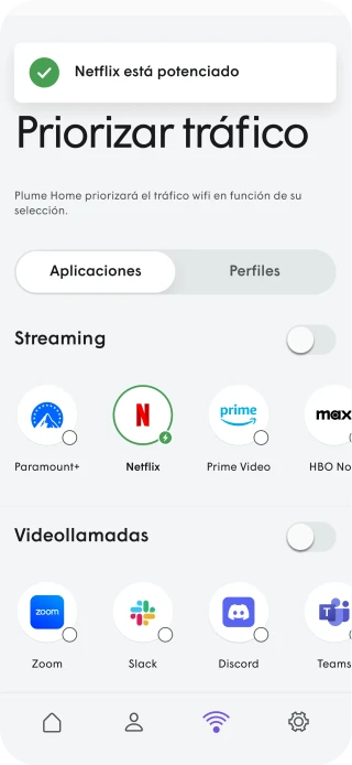 Priorice la conectividad de aplicaciones concretas, categorías específicas (videojuegos, streaming o videollamadas), un dispositivo o una persona para contar con buena conexión cuando más la necesite. Plume Home se asegura de priorizar siempre el tráfico en directo sobre las tareas de red aplazables (como las actualizaciones del sistema operativo) para garantizarle que su videollamada no sufrirá interrupciones. Sin embargo, si desea asegurarse aún más, puede elegir qué priorizar.