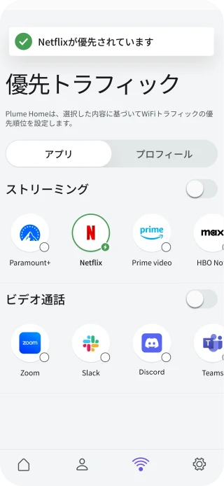 個々のアプリ、特定のカテゴリ (ゲーム、ストリーミング、ビデオ通話)、デバイス、または特定のユーザーの接続を優先し、最も必要なときに確実に接続できるようにします。Plume Homeでは、後回しにできるネットワークのニーズ (OSの更新など) よりも常にライブトラフィックが優先されるようになっています。これにより、ビデオ通話が途切れることを確実に防ぎます。一方で、別の用途に帯域幅を確実に割り当てたい場合は、優先する対象を選ぶことができます。