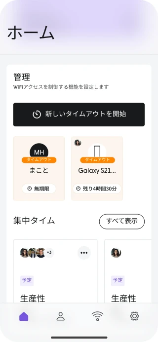 直観的なツールでユーザー、デバイス、インターネットアクセスを管理できます。保護者はデバイスをユーザーに割り当てて、アクセスレベルやフォーカススケジュールを設定したり、デバイスの接続を即時に停止することができます。高度なペアレンタルコントロール機能により、ネットワーク上の各ユーザーまたはデバイスのスクリーンタイムを制限し、子供の年齢に応じたコンテンツのフィルタリングを設定できます。