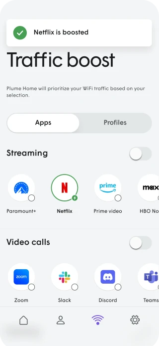 Prioritize connectivity for individual apps, specific categories (gaming, streaming, video calls), a device or a specific person to be confident in your connection when you need it most. Plume Home makes sure to always prioritize live traffic over network needs that can wait (like OS updates) so you can be confident your video call won’t drop. But for those times when you want the extra confidence, you can pick what to prioritize.